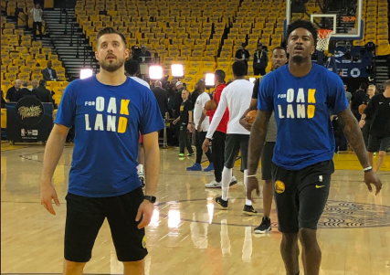 根據(jù)The Athletic記者Sam Amick報(bào)道,勇士在本場(chǎng)比賽前,特別訂做了印有“為了奧克蘭”字樣的球員熱身T-恤衫和毛巾(見(jiàn)新聞配圖),并為了支持此前受傷的球隊(duì)前鋒凱文-杜蘭特,特意將KD兩個(gè)字母印在最后,可以看作是“為了奧克蘭,為了KD”。